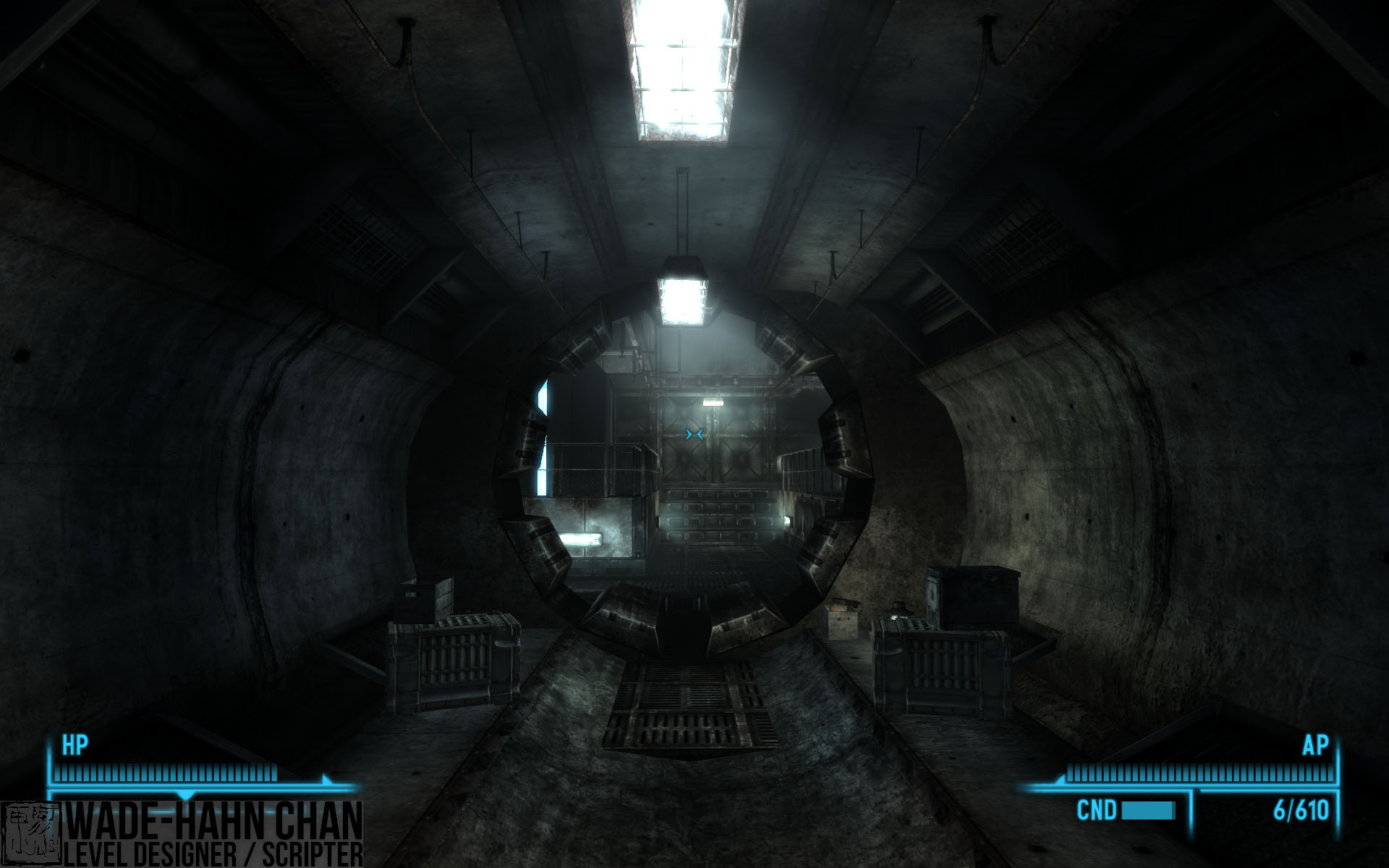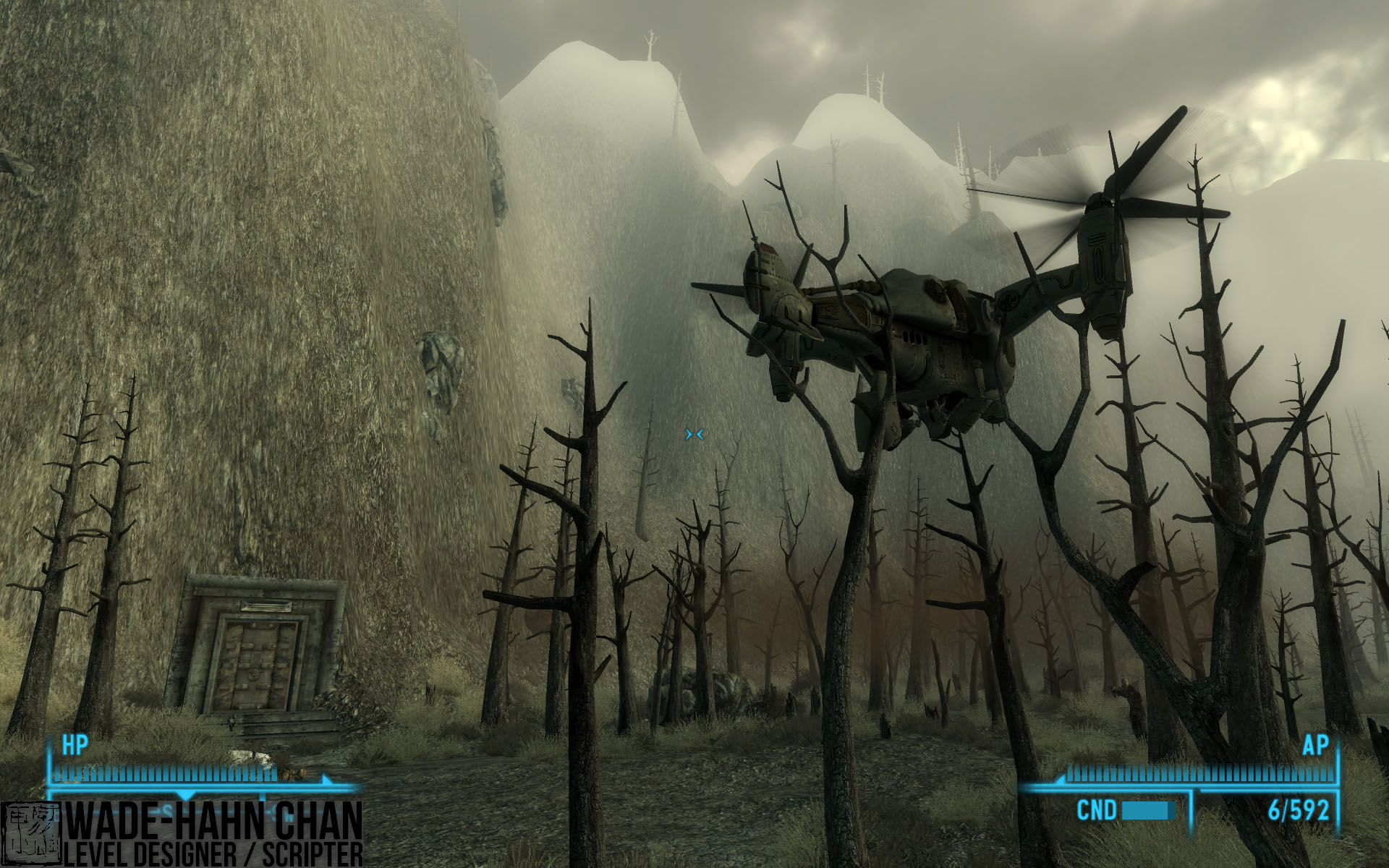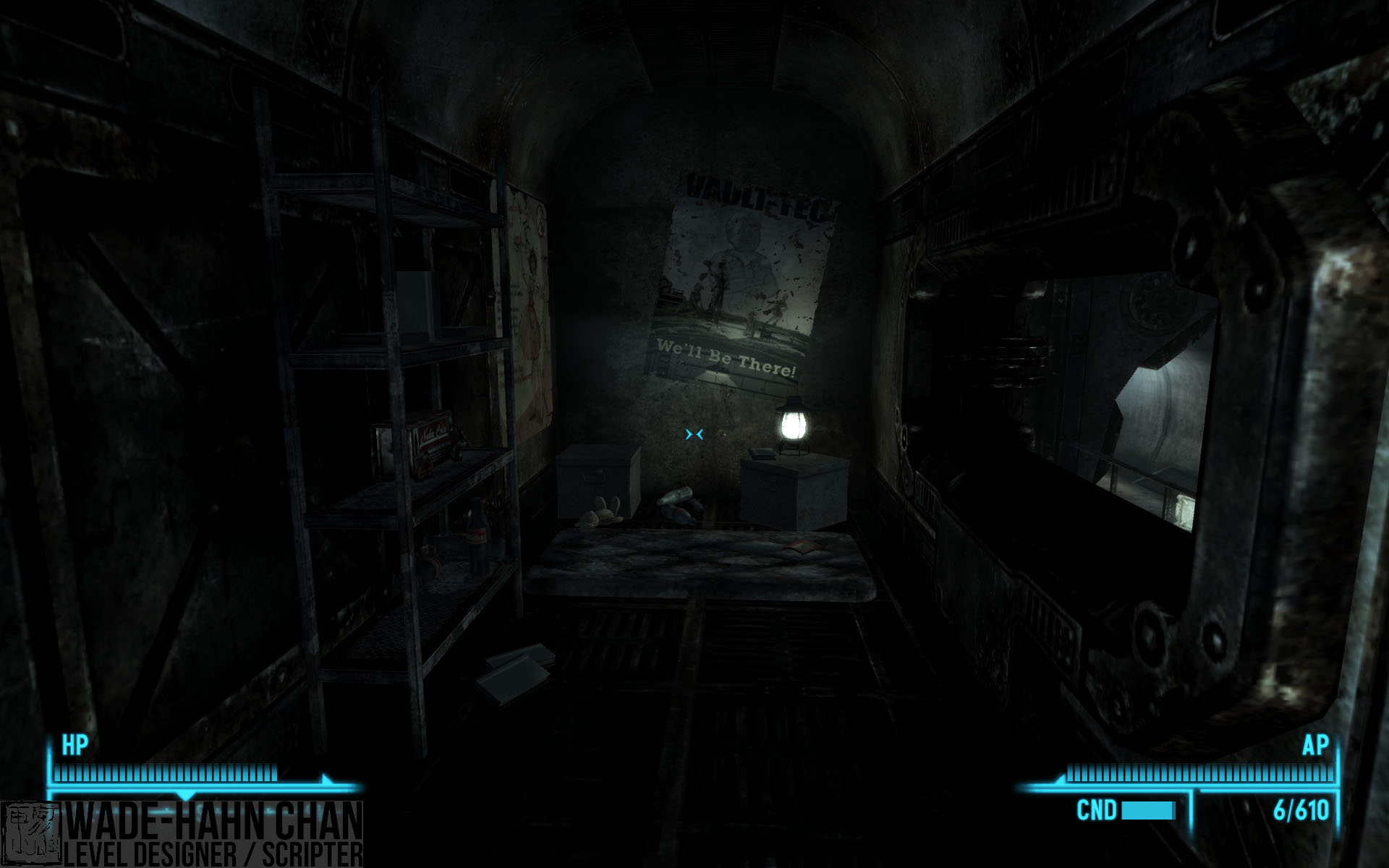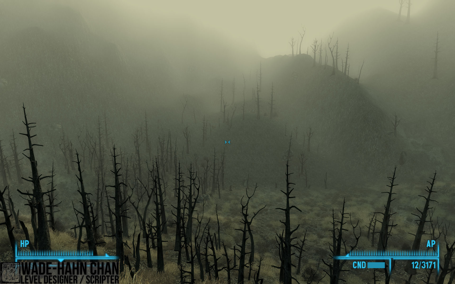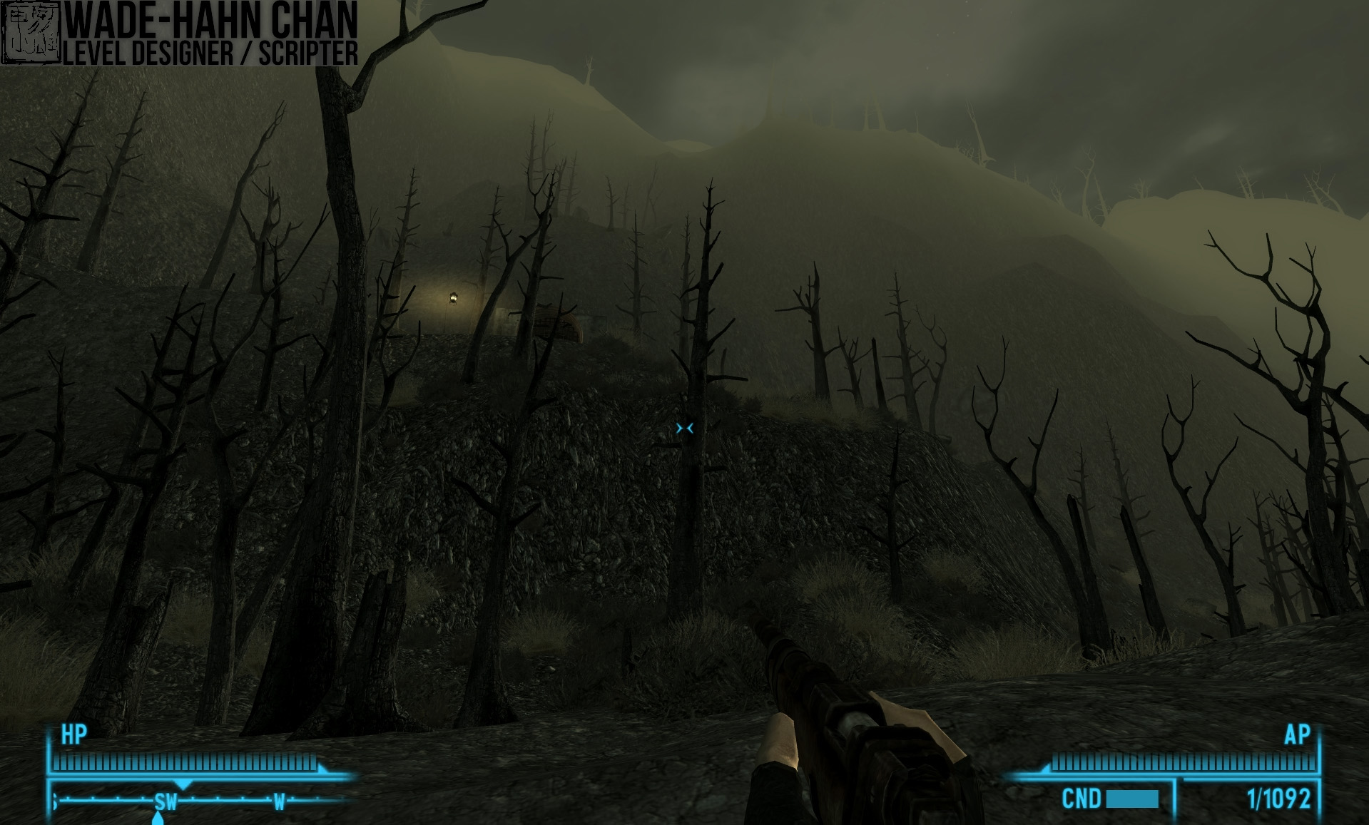 The Bitter End originally took place amongst a marginally larger storyline and landscape, with references to genetic experimentation and other horros within the valley. Due to time constraints, the experience was slightly streamlined to include the main questline dealing with the family. Although the geographical area in the level abstract is almost twice are large as the final level, the map benefits from NPC reuse. Care was taken to ensure that dialogue choices felt similar to NPC interaction in the rest of Fallout 3. Flavor text and quest-related information is easily accessed by the player to avoid confusion.