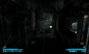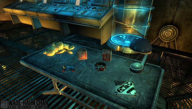 The areas that the non-player characters inhabit feature a large number of side items and arranged set pieces. Little details clue the player into how the inhabitants live their everyday lives. The screenshot above consists of gathered personal effects of one of the NPCs, a young child. The simple inclusion of a detonating slave collar on a table full of toys conveys a considerable amount of information about the character's back story. Other locations include small details--a stash of drugs that implies addiction, a barricaded front entrance to a vault showing a family's preparations for a last ditch defensive effort--that may be unimportant, but boost the overall atmosphere and player involvement.