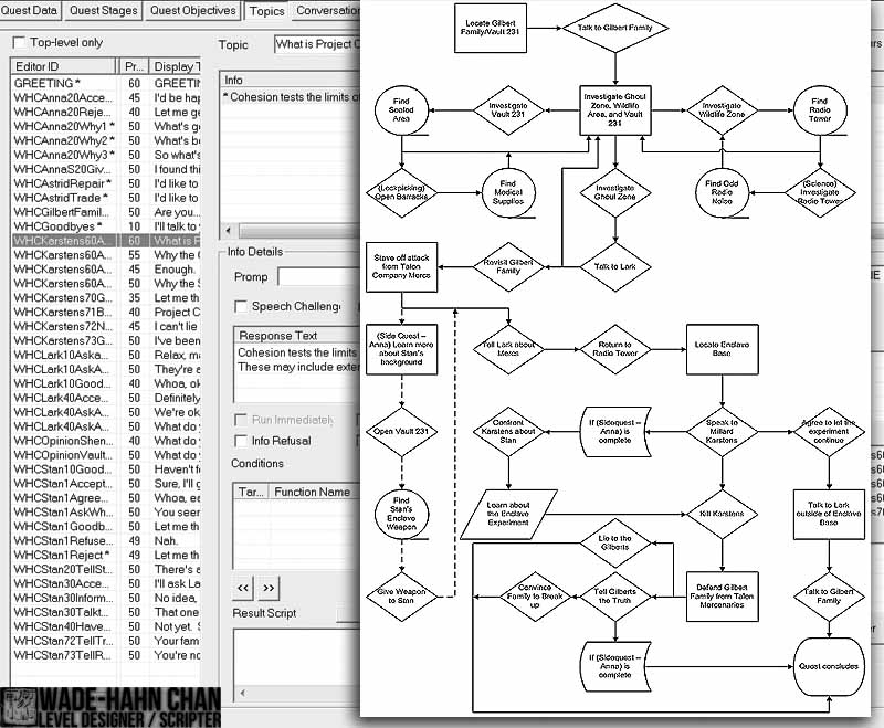 The main quest line places players along a storyline that traverses with dialogues involving five different NPCs. Dialogue was handled so that players can access non-player character's opinions and thoughts without affecting the status of quests. Most importantly, dialogue options and responses change based upon the story progression.
