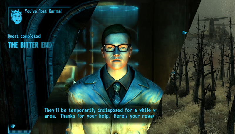The Bitter End is a Fallout 3 quest line set in the Shenandoah Valley area of Virginia. The player helps a family investigate strange circumstances of feral ghoul attacks. The player experiences a fully fleshed out story, with multiple interactable non-player characters around an exterior and three architecturally distinct interiors. The level includes a subquest that affects the outcome of the story, providing three different endings for the player.